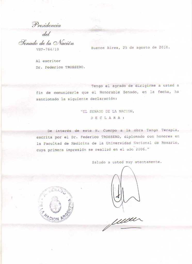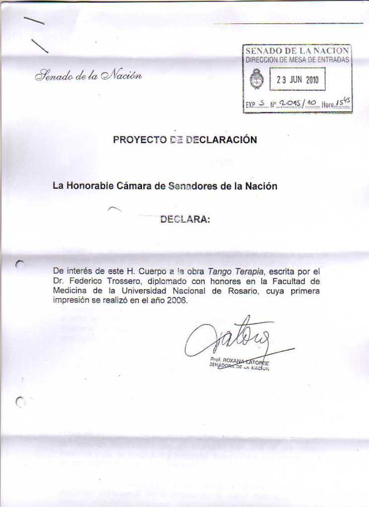 Declaración de interés del libro Tangoterapia por el Honorable Senado de la Nación Argentina
